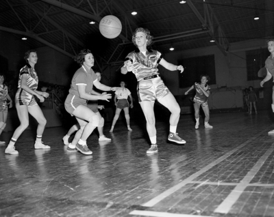 Motorettes' Dot Barton, right, comes in for rebound in city cage title playoff. That's Stevens' Annie Senter trying to intercept. Motorettes won, 33-26. Published in Fort Worth Star-Telegram morning edition, March 4, 1952.