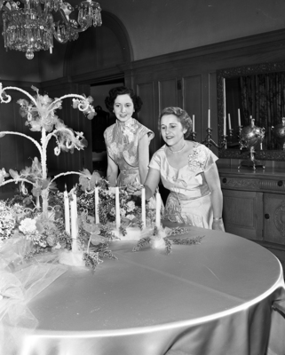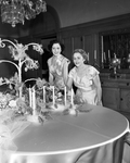 Mrs. Walter Douning, left and Mrs. Melvin J. Miller were hostesses Tuesday at a tea at the Woman's Club when a butterfly and spring garden motif was used in decorating the table. Two hundred and fifty guests called.