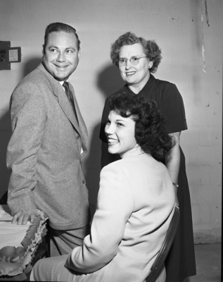 Among distributive education student-employer teams at a banquet Tuesday night in Birdville were Miss Emma Camp, seated, Birdville High School senior, and a representative of her employer, Miss Essie Blake, bookkeeper at Woolworths. Bill N. Newman, supervisor of the program in Fort Worth schools, discusses distributive education with them.