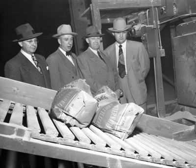 Getting a preview of operations at the new International Minerals and Chemical Corporation fertilizer plant in Fort Worth Wednesday were these men. Left to right: L. H. Wright of Bartlesville, Oklahoma, general sales manager for Phillips Chemical Company; H. R. Krueger of Phillips' technical service division; Dr. R. P. Thomas of Chicago, International's technical service manager, and R. D. Evans of Houston, district sales manager for Phillips. The new plant officially opens Thursday.
