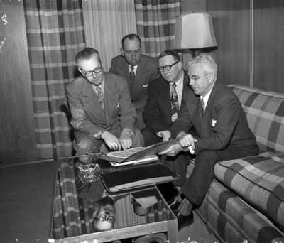 Home repair loans insured by Federal Housing Administration (FHA) were under discussion at a luncheon meeting Wednesday at Fort Worth Club. Left to right are A. E. Soniat president of Texas Mortgage Bankers Association; E. T. Stearns, FHA district director; Ruel T. Mayfield, vice president of First National Bank and Arthur J. Frentz, assistant FHA commissioner.