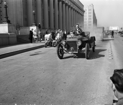 Troy Moore piloted a 1906 Ford along E. Lancaster to help mark 50th anniversary of American Automobile Association here Wednesday. The car cost $3,300 new.