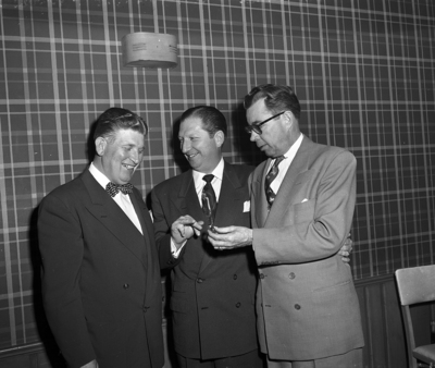 E. J. Plattford, right, Western Division sales manager of Packard Motor Company, presents Albert J. Meek, center, Fort Worth Packard dealer, the first Ring of Distinction awarded to a new car dealer in the division composed of Texas, Oklahoma, Louisiana, New Mexico, and Arkansas. the ring was awarded for leadership in sales and service and best all around performance. Looking on is Vern Doonan of Dallas, zone manager.