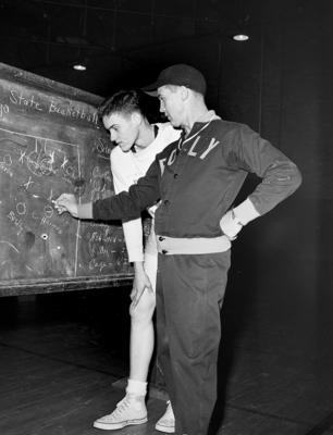 Poly cage ace Richard O'Neal gets last minute instructions from Coach Jack Harley for opening state tournament game at Austin with Sam Houston High of Houston. Published in Fort Worth Star-Telegram evening edition, March 6, 1952.