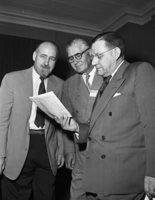 Dr. Robert H. Felix, right, Washington, director, National Institute for Mental Health, illustrates an argument on the need for better state hospital care for mental patients to Dr. H. Warren Dunham, left Wayne University, Detriot, and the R. B. Holt, center, director of the U. S. Public health Service Hospital here, at the state mental health conference Thursday at Hotel Texas.