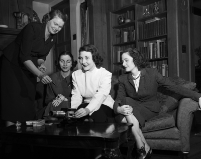 Left to right, Mmes. J. C. Tom Jr., Robert Hobbs, Elizabeth Ford, speech therapist, and Gordon W. Smith discuss slides used in programs for clubs. The Crippled Children's Society, treats more than 85 children a month and is a free center for handicapped children. Published in Fort Worth Star-Telegram evening edition March 16, 1952.