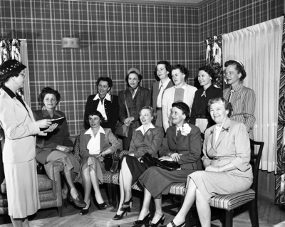 Mrs. Bill London of Brownwood, president of the Women's West Texas Golf Association, is shown addressing directors at the Colonial Country Club. Left to right, seated, are Mrs. Spearl Ellison, of El Paso; Mrs. Lucian Morehead, of Plainview; Mrs. Lucille Morris, of Fort Worth; Mrs. Howard Edmiston, of Brownwood; Mrs. C. E. Dean, of Lubbock. Shown standing, are Mrs. Gene Anderson, of Lubbock; Mrs. Edward A. Dietz, of Fort Worth; Mrs. E. S. Hall, of Lubbock; Mrs. W. K. Stripling Jr., of Fort Worth; Mrs. L. E. Brister, of Kermit; and Mrs. W. C. Gilmore, of Odessa. Published in the morning edition, March 8, 1952.
