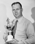 A photograph of Dick Thompson, engraver is shown with city bowling trophy.