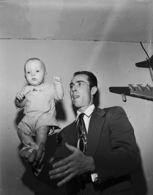 Kenneth Ray McGar celebrated his three-month birthday Friday by showing how he can stand in his father's hand. Son of Mr. and Mrs. H. F. McGar of 936 E. Cantey, Kenneth Ray has been doing this feat easily for three weeks.