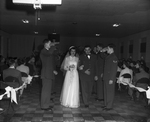Ushers, all airmen from Carswell, give a military salute as Sergeant and Mrs. William LeRoy Rorick leave Veterans' memorial after their wedding Saturday night. The couple, who didn't want a quiet wedding, turned all the arrangements over to the Girls Service Organizations, a hostess group for the Fort Worth Armed Forces Center.
