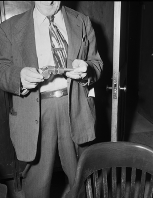 One of the six teen-agers arrested for theft of $1,200 in radio equipment fashioned this.22 caliber pistol out of pipe, wood, bolts and springs.