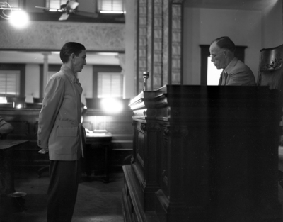 Standing with his hands folded behind him, William Ruthes Ray hears Judge A. P. Mays of Corsicana pronounce formal sentence of death on him for the Trinity Park attack of a 9 year old girl. Published in Fort Worth Star-Telegram evening edition March 17, 1950.