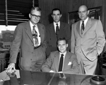 Recently elected officers of the Fort Worth Petroleum Engineers Club. Standing, left to right, are K. C. Howard, H. J. Gruy, and Russell E. Smith. Seated is Ray Elner, president. Published in Fort Worth Star-Telegram evening edition March 16, 1952.