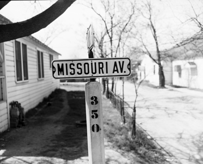 The names of girls, trees, heroes, fruits, and in fact almost any subject you might suggest are represented in the names of Fort Worth streets. The photograph shows a road sign, written "Missouri AV." Published in the Fort Worth Star-Telegram morning edition, March 16, 1952.