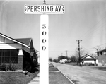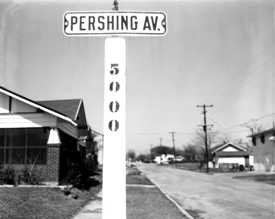 The names of girls, trees, heroes, fruits, and in fact almost any subject you might suggest are represented in the names of Fort Worth streets. The photograph shows a sign board written, "Pershing Av." with numbered location 5000. Published in the Fort Worth Star-Telegram morning edition, March 16, 1952.