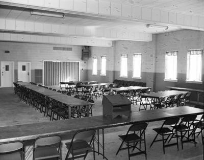 The interior of the dining room of Arlington Heights Christian Church's new educational building, which can accommodate 350 people. Published in Fort Worth Star-Telegram evening edition March 12, 1952.