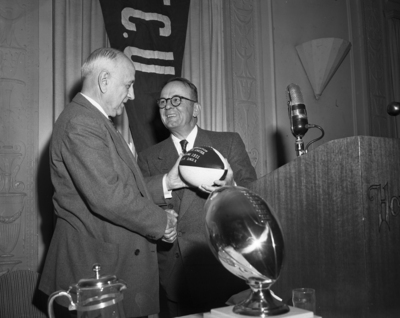 Dutch Meyer, right, shaking Amon Carter's hand while handing him a football.