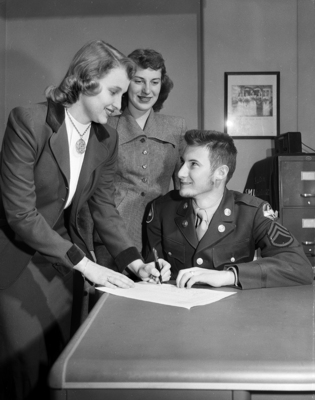 TCU Student Union Backers - This week on the TCU campus students have been signing petitions urging the building of a student recreation building. Carl Graner of Fort Worth, sophomore representative in the Student Association Congress, signs up Miss Sally Moler of Tulsa, Oklahoma, as Miss Pansey Kidwell of Vernon awaits her turn.