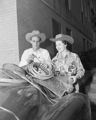Ranch Week at TCU has got everybody in Western costumes this week. TCU Rodeo President Christmas Barber, a junior from Midland, puts finishing touches on his saddle as pretty Sylvia Bokor, Mission, this year's Ranch Week Queen, looks on.