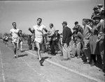 Shown in the middle of a race are Dale Immel, front, and Don Edwards. Next to the running track, spectators watch the race.