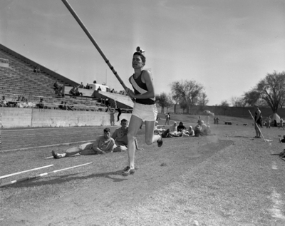 Shown is Randell Morgan in the middle of pole vaulting. In the background are some spectators laying on the field while others watch from the bleachers.