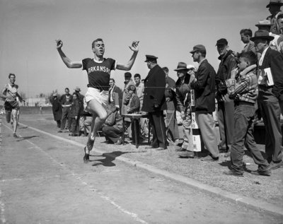Rick Herber from Arkansas is shown as he crosses the finish line. Next to the running tack are spectators waiting for the rest of participants to arrive