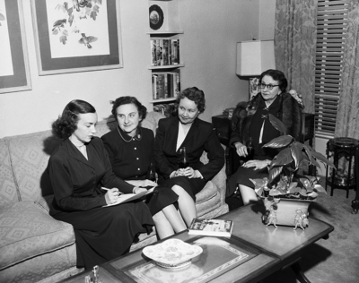 Checking lists of models and reservations, for the YMCA-sponsored style show dinner which will be held Friday night at Colonial Country Club, are left to right, Mmes. Jack Tunstill, Herschel R. York, H. A. Shoemaker, and Will Ed Kemble. Published in Fort Worth Star-Telegram evening edition March 13, 1952.