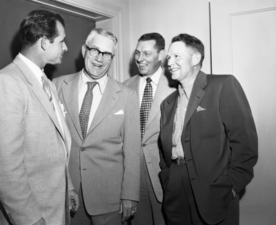 In another corner were Southwest Conference Coaches Jack Wilson of Baylor, Southern Methodist University's McAdoo Keaton, Arkansas' Johnny Morris and Texas Christian University' Mack Clark. Occasion was the annual dinner at the Worth Hotel for the Southwestern Recreation visiting track and field meet official night. Published in Fort Worth Star-Telegram evening edition March 15, 1952.