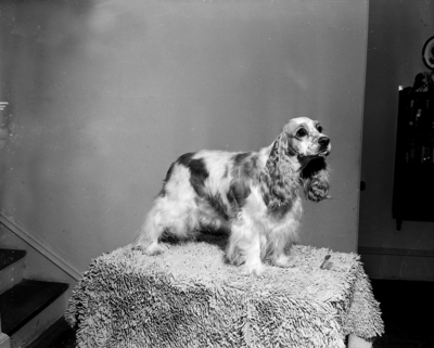 The parti-color cocker spaniel, Champion Cee Dee's Rapsody, owned by Captain and Mrs. William Kelly of Grand Prairie is one of the dogs entered in the Fort Worth Kennel Club's all-breed dog show on April 20. The dog completed its championship at the Fort Worth cocker show last November. Captain Kelly is serving with the Air Force in Korea. Published in Fort Worth Star-Telegram morning edition, March 16, 1952.