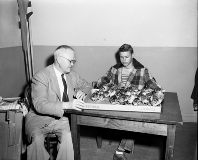 Participants in a new turkey improvement program started at Brownwood are Roy Harris, left, one of the business men sponsors, and Albert Retch, Brownwood FFA boy. One girl and nine boys received 50 turkey poults each to start the new program. Published in Fort Worth Star-Telegram morning edition March 8, 1952.