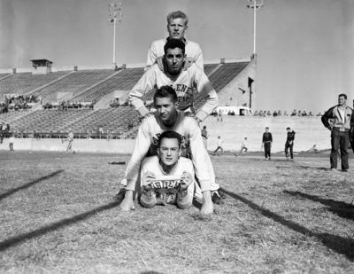 Hottest relay team at the Southwestern Recreation track meet was Abilene Christian's mile set, with a record time of 3:20.9. Top to bottom are George Adrian, Sam Volpe, Burl McCoy and Buddy Garner. Published in Fort Worth Star-Telegram morning edition March 17, 1952.