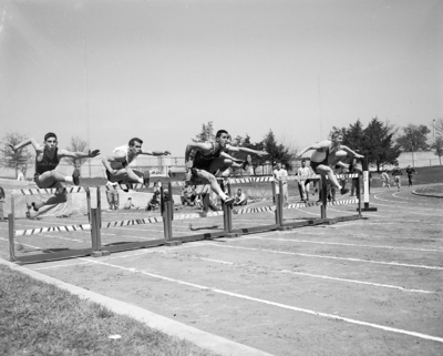 Eddie Roberts, third from left, clears the first hurdle on his way to a record 14.3 in the 120-highs at the Southwestern Recreation track meet. Others, left to right, are Dean Burch, Stillwater; Leon Billington, Stamford; Weldon Glasscock, Dallas Forest Avenue (behind Roberts); Billy Huddleston, Iraan, and James Guimarin, North Dallas (behind Huddleston). Roberts also set a record in the 180-yard low hurdles and won the 100-yard dash. Published in Fort Worth Star-Telegram morning edition March 16, 1952.
