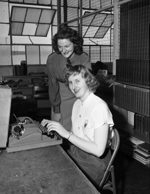 Ava Lee Weaks, seated, winner of the first prize in the Star-Telegram's scholastic writing contest, shares her pleasure with her teacher, Mrs. W. B. Parks. The Underground Finger-Flight Champion portable typewriter was won with a short story in a contest sponsored nationally by Scholastic Magazines. Ava Lee is a senior at Glen Rose High School and the daughter of Mr. and Mrs. A. H. Weaks. Published in Fort Worth Star-Telegram evening edition March 15, 1952.