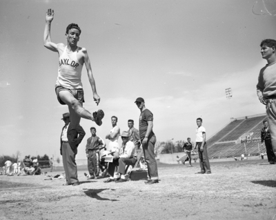 Jack Lucas of Baylor stretches high and far for leap of 22 feet and 6-half inches and first place in university division broad jump. Published in the Fort Worth Star-Telegram morning edition, March 19, 1950.