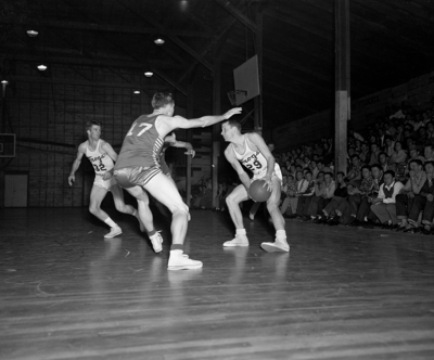 Frogs' Dick Allen (29) makes like football T quarterback as he prepares to pitch out to Johnny Swaim (32), man in motion. Fort Sam Houston's Jim Jordan (17) defends. Frogs won, 87-45. Published in Fort Worth Star-Telegram evening edition, March 17, 1952.