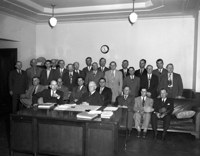 Organized crime and official corruption, if any, in the Northern Judicial District of Texas will be probed by this grand jury impaneled here. Federal judge Davidson, seated in the center, and U.S. Attorney Potter, to the judge's right, are shown with the grand jurors in the chamber of the U.S. Courthouse. Seated, left to right, are Paul Grable, G. A. Caraway, Clyde P. Weed, Wallace McKenzie, B. W. Neie, S. H. Huffman, and M. R. Durway. Standing, left to right, are U.S. Deputy Marshall Cross, Fred Davis, Arlis Haun, J. D. McNutt, George W. Pegues, Albert S. Drain, Otis Thomas, Fred Hall, H. G. Harkins, E. S. Fagan, R. M. Cate, J. A. Birdwell, Harold Jenkins, Whaley Wagnon Jackson, Ben L. May, Joe B. Frey, and Chester L. Bassham. Published in Fort Worth Star-Telegram evening edition March 17, 1952.