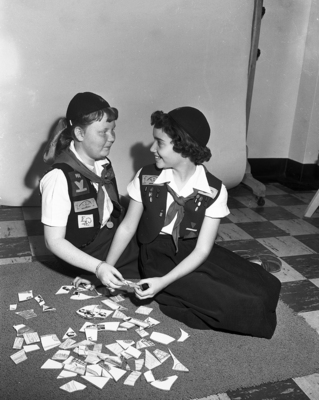 Linda Allen, left, and Martha Lynne Lain, members of the Wa-Han-Ka Camp Fire Group of Bluebonnet School, are shown piecing together a giant jigsaw puzzle that when finished depicts camp fire life in their group. The puzzle is the group's project for the 42nd birthday of the Camp Fire Group. Published in Fort Worth Star-Telegram evening edition March 17, 1952.