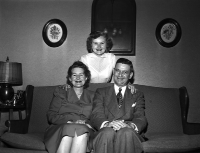 Mr. and Mrs. Herbert R. Anderson of Swampscott, Mass., seated and their daughter, Miss Betty Jane Anderson, a student at Texas State College for Women (TSCW), standing, were week-end guests of Mr. and Mrs. Ronald A. Rhodes, 1107 South Henderson Street. Mrs. Anderson is a member of Chi Omega sorority. She will leave to join her husband in St. Louis.