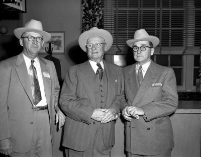 Left to right, Eck Brown, Dalhart rancher, was one Texan who made a favorable report on range and cattle conditions in his area. G. A. McClung of Fort Worth, who operates the McClung Land and Cattle Company in Texas and Kansas, was busy with cattlemen and getting the latest reports about the industry. Clyde McClung, Cleburne, says his information is that moisture conditions are very favorable in both Oklahoma and Kansas. Published in Fort Worth Star-Telegram morning edition, March 18, 1952.