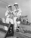 Veterans Johnny Ethridge, left, and Johnny Swaim, who played basketball for Texas Christian University in National Collegiate Athletic Association meet at Kansas City, get into baseball uniforms. Published in Fort Worth Star-Telegram morning edition, April 25, 1952.