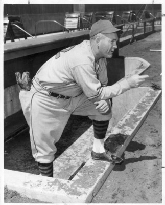 Rogers Hornsby shown in dugout, Fort Worth minor league baseball manager in 1952.