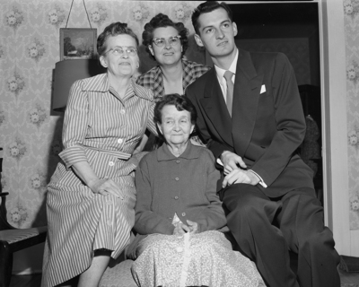 Four generations were represented at a gathering at the home of Mrs. C. W. Vance, 1234 Gould. Seated is Mrs. T. A. Parker, 76, Weatherford, and behind, left to right, are Mrs. Vance, 58; Mrs. C. A. Mitchell, 41, of 2723 Loving, and Vance Mitchel, 19, of the Loving address. Published in Fort Worth Star-Telegram morning edition, March 20, 1950.