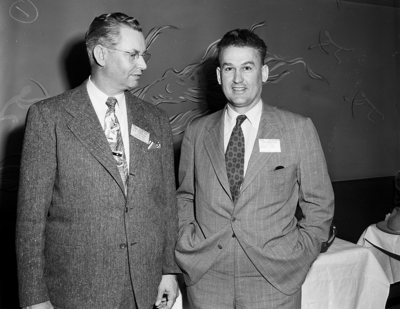R. B. Anderson of Vernon, left, a member of the National Livestock Tax Committee, and Stephen Hart of Denver, committee general counsel, talked tax problems at the cattlemen's convention. Published in Fort Worth Star-Telegram morning edition March 19, 1952.