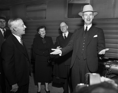 Sir Oliver Franks, British Ambassador to the United States, shows off a newly presented Texas-made hat at the Santa Fe Station upon his arrival in Fort Worth on his initial visit to Texas. At left is Mayor Edwards and in the background is J. Thyne Henderson, British consul-general in Texas. Published in Fort Worth Star-Telegram evening edition March 18, 1952.