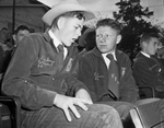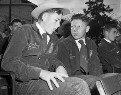 Jim Harkey, left, and David Vance of Alpine, at the Huntsville meeting of the Texas Association of Future Farmers of America, heard Governor Shivers warn against planned economy and paternalistic government. Published in Fort Worth Star-Telegram morning edition, March 19 1950.