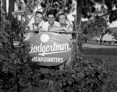 Leaders in the Cats' 7-3 victory over Pueblo were Odbert Hamric, left, slugging outfielder and Ralph Butler, pitcher, right. The player in the middle is Ted Del Guerico. The three are shown over the entrance sign at the Cats' Vero Beach spring training camp. Published in Fort Worth Star-Telegram morning edition, March 30, 1952.