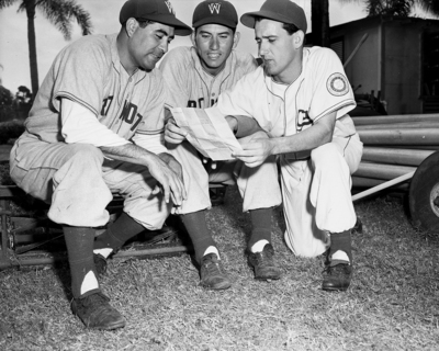 Vicente Lopez of Havana, Cuba, right, with Cats in 1951, explains things to infielder Fred Monge, left, of Wilmington, California and catcher Miguel Gasper of Sonora, Mexico. Published in Fort Worth Star-Telegram evening edition, March 24, 1952.