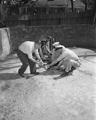 Harry Jackson, left front, in charge of the snake display at Forest Park Zoo, holds head of 17-foot python as other workers help place the snake in pit after confinement in winter quarters. Behind Jackson are Pete Pinyan and Jake Smith. At right are Clyde Smith and A. B. Smith. Published in Fort Worth Star-Telegram morning edition, March 23, 1952.