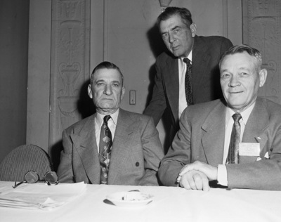 Pictured are new officers of the Texas and Southwestern Cattle Raisers Association. Sitting, left, is Jack Roach of Amarillo, new president. Standing is R. J. Kleberg Jr. of Kingsville, new second vice president. At right is J. M. Crews of Childress, first vice president. Published in Fort Worth Star-Telegram morning edition March 20, 1952.