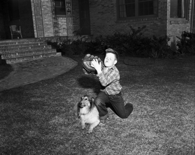 Tommy Mitchell and his dog got a jump in the vernal equinox when Tommy dug out his fielder's glove after a winter's hibernation. Published in Fort Worth Star-Telegram evening edition March 19, 1952.